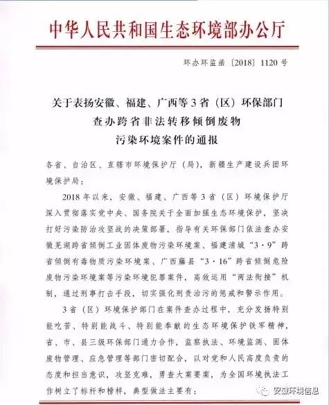 因指導有關環(huán)保部門依法查辦蕪湖跨省傾倒污染環(huán)境案,為全國環(huán)境執(zhí)法工作樹立了標桿和榜樣,近日,安徽環(huán)保廳被生態(tài)環(huán)境部辦公廳通報表揚。通報指出,2018年以來,安徽、福建、廣西等3省(區(qū))環(huán)境保護廳深入貫徹落實黨中央、國務院關于全面加強生態(tài)環(huán)境保護,堅決打好污染防治攻堅戰(zhàn)的決策部署,指導有關環(huán)保部門依法...