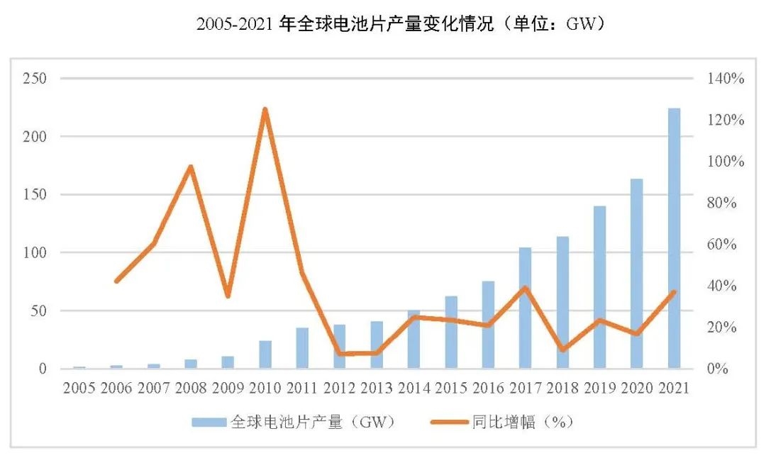 一、全球電池片產(chǎn)業(yè)發(fā)展情況 2021年太陽能電池片環(huán)節(jié)延續(xù)了2020年的擴(kuò)產(chǎn)基調(diào),產(chǎn)能大幅增加。全球晶硅太陽能電池片總產(chǎn)能達(dá)到423.5GW,同比增長69.8%;總產(chǎn)量為223.9GW,同比增長37%。 從產(chǎn)能情況看,頭部企業(yè)持續(xù)擴(kuò)產(chǎn),前十名全部為中國企業(yè)。天合光能、晶澳科技、晶科能源等也不斷擴(kuò)大電...