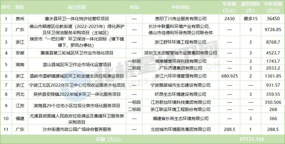 詳情如下:項(xiàng)目名稱:貴州省惠水縣環(huán)衛(wèi)一體化特許經(jīng)營權(quán)項(xiàng)目中標(biāo)單位:貴陽丁川偉業(yè)服務(wù)有限公司中標(biāo)金額:2430萬元/年,最高36450萬元服務(wù)時(shí)間:8+N(N最少不低于2年,最高不超過7年)服務(wù)內(nèi)容:特許經(jīng)營范圍包括約291萬平方米的城市各級(jí)道路及好花紅景區(qū)的日常清掃保潔,9個(gè)轉(zhuǎn)運(yùn)站的維護(hù)管理,城市建...