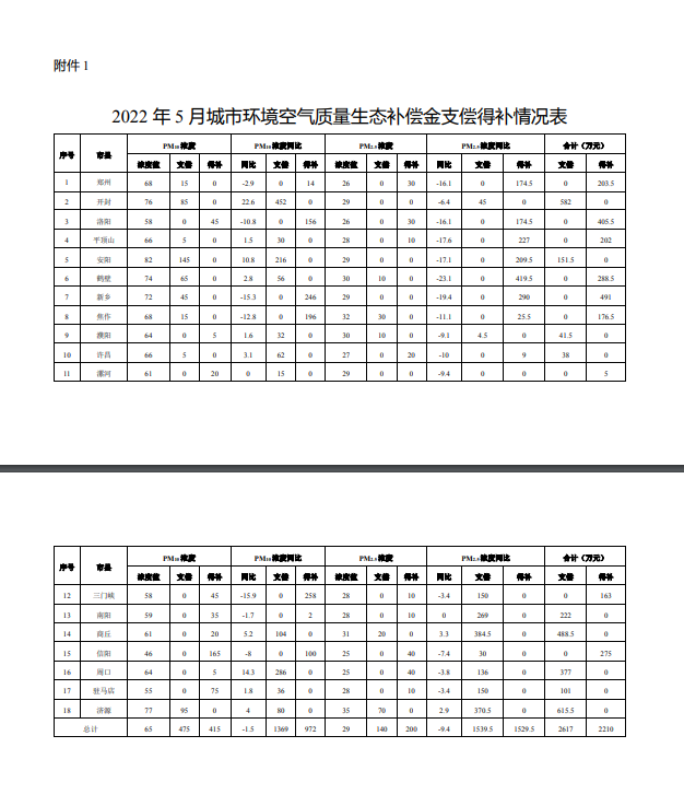 根據《河南省污染防治攻堅戰(zhàn)領導小組辦公室關于印發(fā)河南省城市環(huán)境空氣質量生態(tài)補償辦法(試行)等辦法的通知》(豫環(huán)攻堅辦〔2020〕15號)要求,河南省生態(tài)環(huán)境廳廳對各省轄市的城市環(huán)境空氣質量生態(tài)補償金的支償、得補情況進行了計算。截止2022年5月,各省轄市共支償城市環(huán)境空氣質量生態(tài)補償金2617萬元,...
