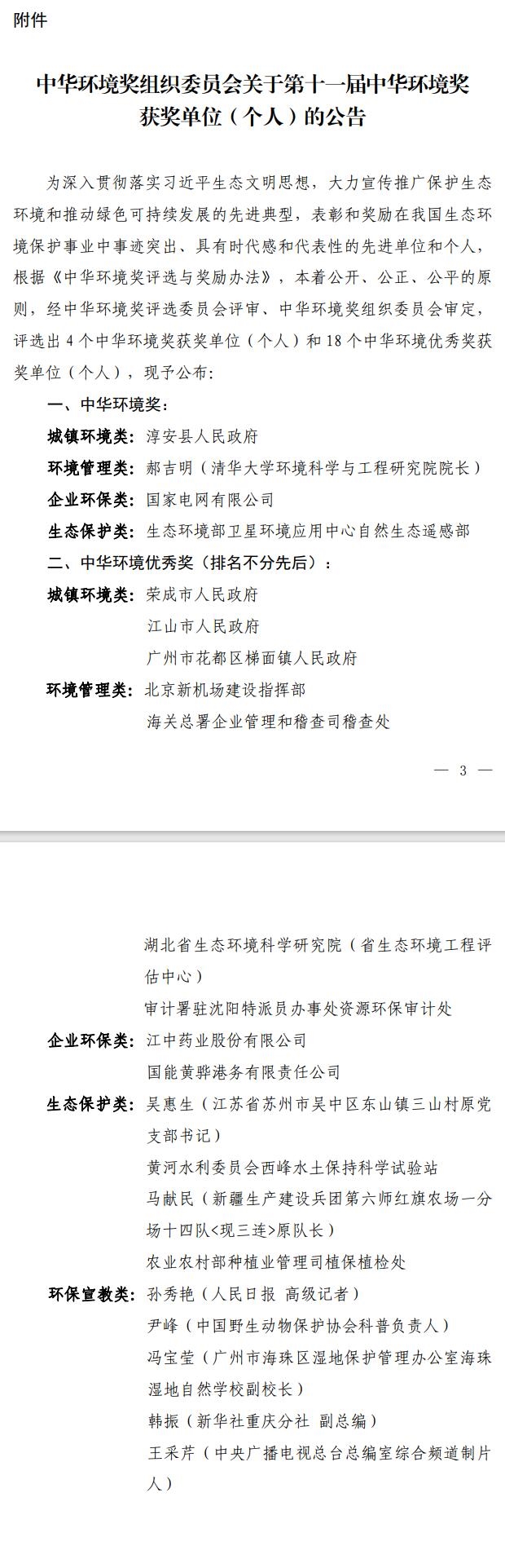 關(guān)于公布第十一屆中華環(huán)境獎(jiǎng)評(píng)選結(jié)果的通知 國(guó)務(wù)院各有關(guān)部門(mén)辦公廳(室),各省、自治區(qū)、直轄市和計(jì)劃單列市生態(tài)環(huán)境廳(局): 為深入貫徹落實(shí)習(xí)近平生態(tài)文明思想,大力宣傳推廣保護(hù)生態(tài)環(huán)境和推動(dòng)綠色可持續(xù)發(fā)展的先進(jìn)典型,堅(jiān)決打好污染防治攻堅(jiān)戰(zhàn),建設(shè)美麗中國(guó),促進(jìn)人與自然和諧共生,由全國(guó)人大環(huán)資委、全國(guó)政協(xié)...