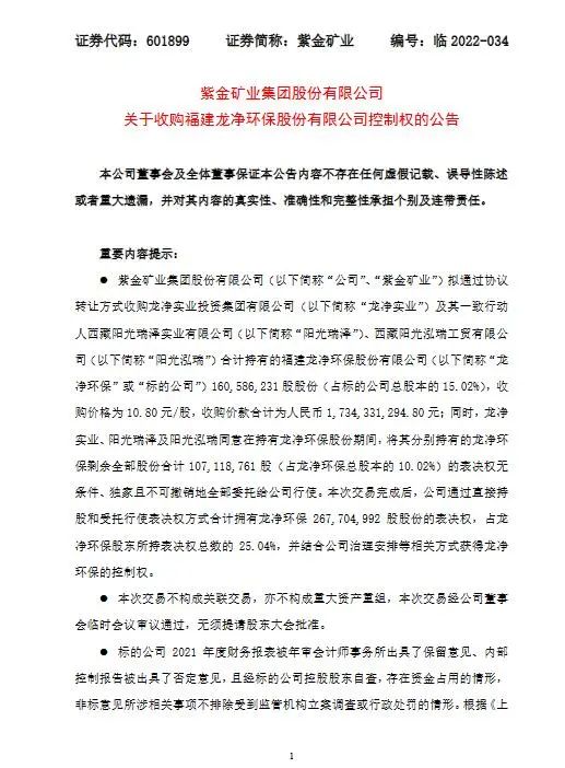 5月9日紫金礦業(yè)公告,擬通過協(xié)議轉(zhuǎn)讓方式收購(gòu)龍凈實(shí)業(yè)投資集團(tuán)有限公司及其一致行動(dòng)人西藏陽(yáng)光瑞澤實(shí)業(yè)有限公司、西藏陽(yáng)光泓瑞工貿(mào)有限公司合計(jì)持有的福建龍凈環(huán)保股份有限公司1.606億股股份(占標(biāo)的公司總股本的15.02%),收購(gòu)價(jià)格為10.80元/股,收購(gòu)價(jià)款合計(jì)為人民幣17.34億元。同時(shí),龍凈實(shí)業(yè)、...