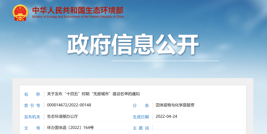關(guān)于發(fā)布“十四五”時期“無廢城市”建設(shè)名單的通知各省、自治區(qū)、直轄市生態(tài)環(huán)境廳(局): 為落實《中共中央 國務(wù)院關(guān)于深入打好污染防治攻堅戰(zhàn)的意見》和《“十四五”時期“無廢城市”建設(shè)工作方案》(以下簡稱《工作方案》),我部會同有關(guān)部門,根據(jù)各省份推薦情況,綜合考慮城市基礎(chǔ)條件、工作積極性和國家相關(guān)重大...