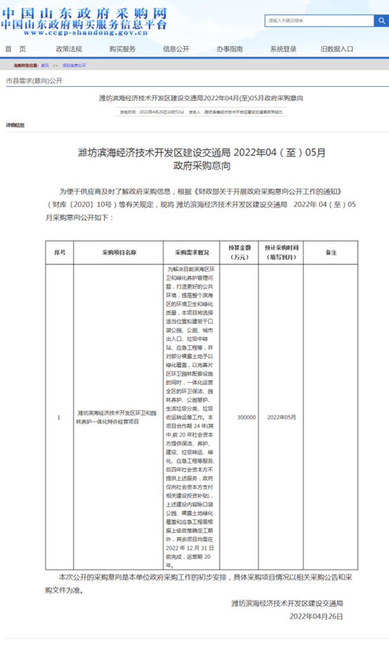 采購項目名稱:濰坊濱海經(jīng)濟技術(shù)開發(fā)區(qū)環(huán)衛(wèi)和園林養(yǎng)護一體化特許經(jīng)營項目預(yù)算金額:300000(萬元)預(yù)計采購時間:2022年05月采購需求概況:為解決目前濱海區(qū)環(huán)衛(wèi)和綠化養(yǎng)護管理問題,打造更好的公共環(huán)境,提高整個濱海區(qū)的環(huán)境衛(wèi)生和綠化質(zhì)量,本項目將選擇適當(dāng)位置擬建若干口袋公園、公廁、城市出入口、垃圾中...