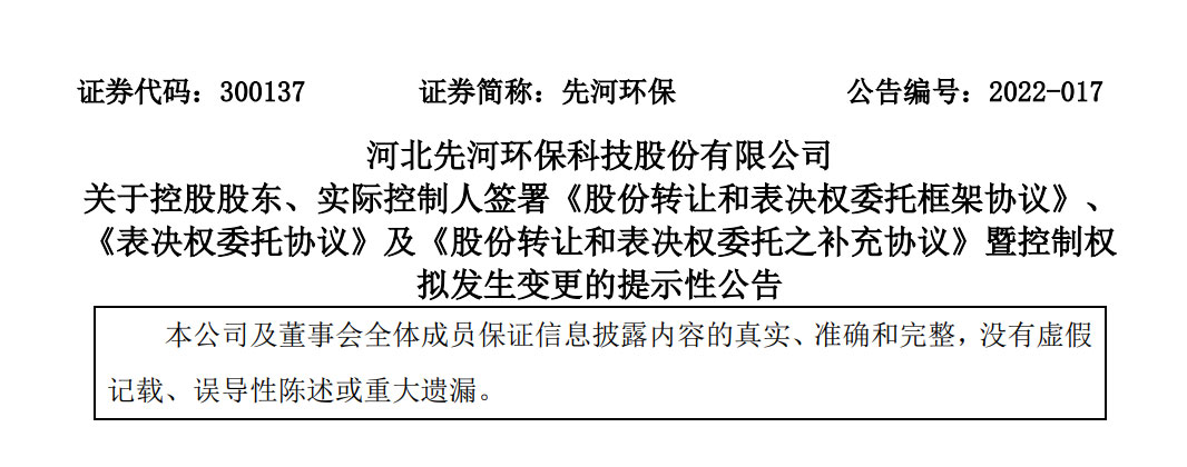五一前后,環(huán)保行業(yè)大事不斷,前有博天環(huán)境和龍凈環(huán)保先后ST,后有先河環(huán)??刂茩嘁字?。5月4日晚間,先河環(huán)保公告稱,公司控股股東、實際控制人李玉國與青島清利新能源有限公司(下稱“清利新能源”)簽署協(xié)議,擬將其持有的先河環(huán)保的566.75萬股股份轉讓給清利新能源,同時還將其持有的先河環(huán)保5186.95萬...
