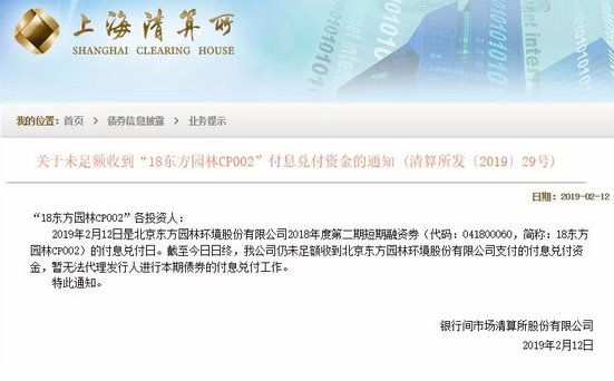 上海清算所2月12日晚間公告稱,未足額收到“18東方園林CP002”付息兌付資金,已經(jīng)實(shí)質(zhì)性違約。其中,18東方園林CP002本月12日到期,金額5億元,為去年2月發(fā)行,票面利率6%,期限一年。東方園林迅速回應(yīng)稱“我司已于春節(jié)前將5億本金匯至上清所賬戶,剩余3000萬(wàn)利息原計(jì)劃于近日匯出,但由于節(jié)后...