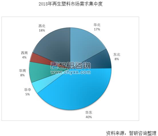 再生塑料行業(yè)屬于充分競(jìng)爭(zhēng)的行業(yè),行業(yè)內(nèi)企業(yè)數(shù)量眾多,競(jìng)爭(zhēng)較為激烈,提升品牌形象是再生塑料企業(yè)生存和發(fā)展的關(guān)鍵。隨著我國(guó)經(jīng)濟(jì)的迅速發(fā)展,國(guó)內(nèi)再生塑料總體需求的持續(xù)擴(kuò)大,以及下游行業(yè)需求層次的不斷變化,行業(yè)的總體供求關(guān)系將發(fā)生改變,行業(yè)競(jìng)爭(zhēng)可能進(jìn)一步加劇。2018年我國(guó)再生塑料需求市場(chǎng)主要集中在華東、西北、華北三個(gè)地區(qū),三者占比達(dá)65%。