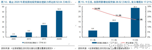 十三五是垃圾焚燒方式對填埋等方式替代的過程,從產(chǎn)能復(fù)合增速角度,十三五年均復(fù)合增速仍有17.2%,雖低于十二五的21.3%,但仍可稱作成長行業(yè)。