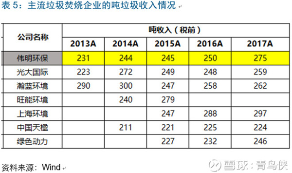 結(jié)論1:從噸收入(稅前)的角度,偉明環(huán)保依靠其最高的噸上網(wǎng)電量,其綜合噸垃圾處置收入約275元(2017年),低于上海環(huán)境(主要是噸垃圾處置費太高),高于其他同行!