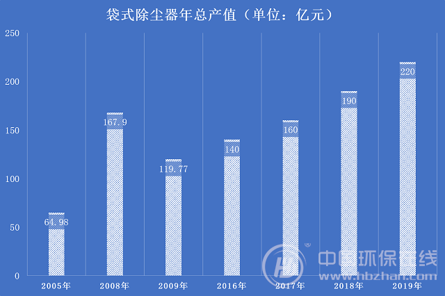 統(tǒng)計(jì)數(shù)據(jù)顯示,我國袋式除塵行業(yè)總產(chǎn)值在2005年~2008年期間增長(zhǎng)最快,從64.98 億元/年上升至167.90 億元/年,年均增長(zhǎng)率高達(dá)37.23%。2009年受全球金融危機(jī)影響,總產(chǎn)值下滑至119.77億元。過去幾年,袋式除塵行業(yè)處于去產(chǎn)能的深度調(diào)整期,總產(chǎn)值在150億元/年左右徘徊。