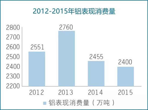 2015年全球原鋁需求為5,771萬噸,較2014年上升386.9萬噸。2015年全球原鋁產(chǎn)量增加410.3萬噸。中國(guó)區(qū)域鋁表觀消費(fèi)者由2012年的2551萬噸下降到2015年的2400萬噸。