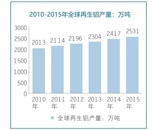 2010年全球再生鋁產(chǎn)量為2013萬噸,2015年增長(zhǎng)至2531萬噸。