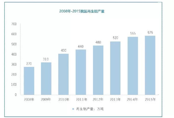 2008年中國(guó)再生鋁產(chǎn)量為270萬噸,近年來由于有道國(guó)家宏觀調(diào)控,各種能源可再生政策發(fā)布,以及我國(guó)“十二五”和“十三五”可持續(xù)發(fā)展的要求,我國(guó)鋁再生產(chǎn)業(yè)發(fā)展速度,2015年再生鋁產(chǎn)量達(dá)到了575萬噸,同時(shí)鋁再生平均增長(zhǎng)率達(dá)到12.3%。
