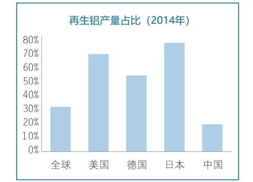 發(fā)達(dá)國(guó)家的再生鋁產(chǎn)量已經(jīng)普遍超過原鋁產(chǎn)量。根據(jù)USGS的統(tǒng)計(jì)數(shù)據(jù),2014年美國(guó)再生鋁產(chǎn)量為364萬噸,而原鋁產(chǎn)量?jī)H為171萬噸,再生鋁產(chǎn)量占總產(chǎn)量的68%,日本2014 年的再生鋁產(chǎn)量占總產(chǎn)量的76%。