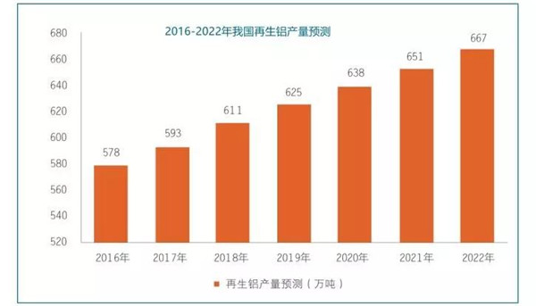 近年來,經(jīng)濟(jì)發(fā)展突飛猛進(jìn),隨之而來的便是節(jié)約資源、保護(hù)環(huán)境等要求,中國(guó)再生鋁企業(yè)受益迅速成長(zhǎng)。2008年,再生鋁產(chǎn)量達(dá)到270萬噸,至2015達(dá)到575萬噸。由于受到國(guó)內(nèi)鋁市供需不平衡的影響,近幾年鋁價(jià)下降維持平穩(wěn),局部小反彈,大多數(shù)再生鋁企業(yè)利潤(rùn)提升,再生鋁行業(yè)未來前景開始回升。按照2006年到2015再生鋁的增長(zhǎng)趨勢(shì),預(yù)計(jì)2016再生鋁產(chǎn)量達(dá)到578萬噸,2022年再生鋁產(chǎn)量達(dá)到667萬噸。