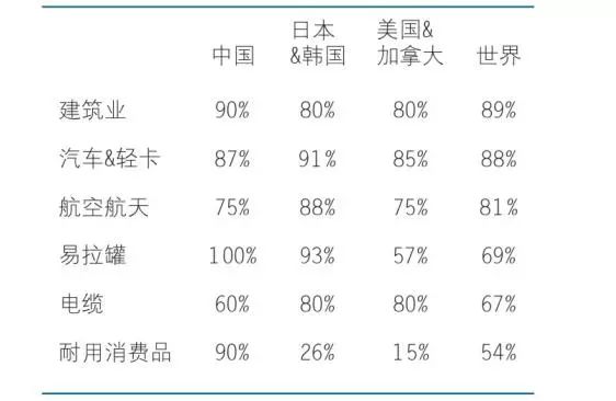 下表是我國(guó)與其他國(guó)家廢鋁回收率情況對(duì)比: