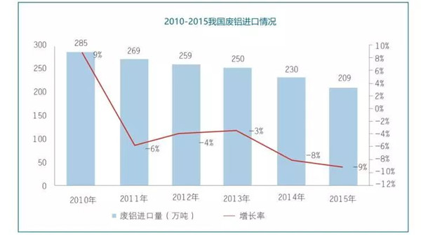 中國(guó)鋁儲(chǔ)存量雖然多,但是我國(guó)可持續(xù)發(fā)展戰(zhàn)略要鋁資源是需要循環(huán)利用的,所以我國(guó)不但國(guó)內(nèi)回收廢鋁,每年還會(huì)進(jìn)口回收國(guó)外的廢鋁,2010年我國(guó)廢鋁進(jìn)口285萬噸,同比增長(zhǎng)9%。2015年我國(guó)進(jìn)口廢鋁209萬噸,同比下降9%。