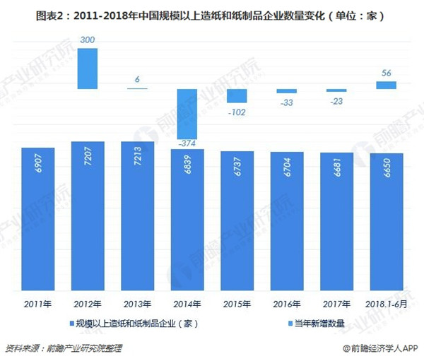在國家一系列環(huán)保政策的影響下,我國造紙龍頭企業(yè)競爭力增強,造紙行業(yè)集中度不斷提升。2018上半年規(guī)模以上企業(yè)數(shù)量得到快速增長,從2017年末的6681家增長至6650家,半年內(nèi)增長了56家,這是2013年以來我國造紙行業(yè)規(guī)模以上企業(yè)增速最快的一年。