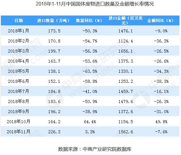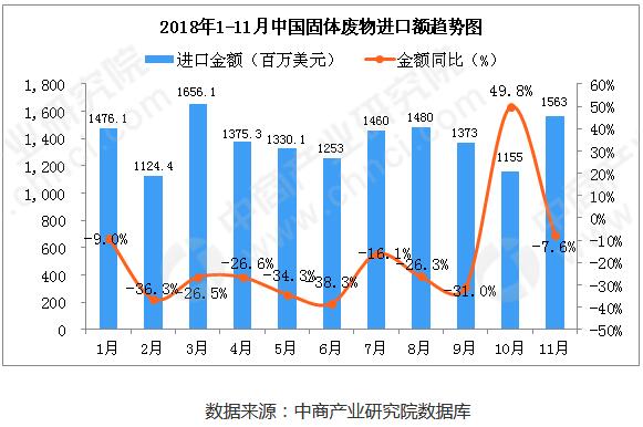 從金額方面來看,2018年8-10月中國固體廢物進(jìn)口金額呈下降趨勢,2018年11月中國固體廢物進(jìn)口金額有大幅度回升;2018年11月中國固體廢物進(jìn)口金額為1563百萬美元,同比下降7.6%。