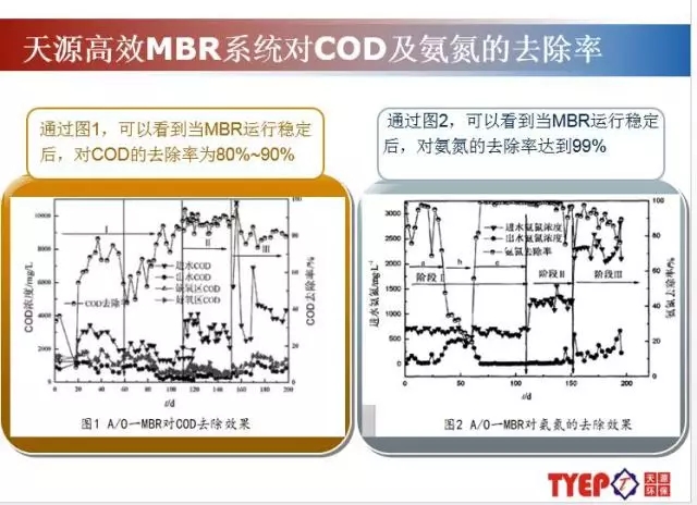 天源環(huán)保有10多年的深入摸索,對內(nèi)置式MBR,外置式MBR分別具備大量工程應(yīng)用,對其優(yōu)缺點很明顯,并且針對性解決各自的瓶頸問題。由上圖可以看到當(dāng)MBR運行穩(wěn)定后,對COD的去除率為80%~90%,對氨氮的去除率達(dá)到99%。