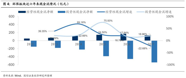 而從投資性現(xiàn)金流來(lái)看,2015年開(kāi)始行業(yè)進(jìn)入PPP模式大發(fā)展時(shí)代,環(huán)保企業(yè)對(duì)外投資支出大幅增加。到2016/2017年行業(yè)投資性現(xiàn)金流流出增長(zhǎng)保持在18%左右。到2017年底,我統(tǒng)計(jì)的環(huán)保企業(yè)合計(jì)的投資性現(xiàn)金流流出凈額已經(jīng)超過(guò)經(jīng)營(yíng)性現(xiàn)金流凈額的4倍,環(huán)保企業(yè)資金壓力大。
