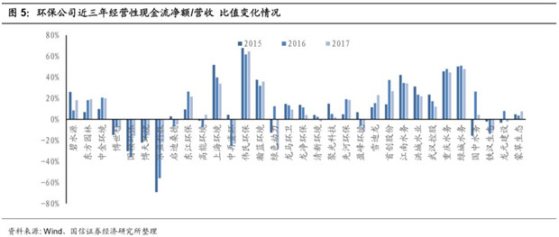 PPP帶動(dòng)投資性現(xiàn)金流支出的大幅提升使得環(huán)保企業(yè)現(xiàn)金流緊張。從經(jīng)營(yíng)性現(xiàn)金流來(lái)看,雖然近年來(lái)環(huán)保企業(yè)營(yíng)收和利潤(rùn)大幅增長(zhǎng),經(jīng)營(yíng)性現(xiàn)金流有所改善,但經(jīng)營(yíng)性現(xiàn)金流的增長(zhǎng)卻趕不上營(yíng)收和利潤(rùn)的增速?,F(xiàn)金回流成為業(yè)績(jī)高速增長(zhǎng)的環(huán)保行業(yè)的一大痛點(diǎn)。環(huán)保板塊整體經(jīng)營(yíng)性現(xiàn)金流凈額的增速?gòu)?015年開(kāi)始顯著下降,而對(duì)應(yīng)的凈利潤(rùn)增速卻同年顯著上升。到2017年,環(huán)保板塊整體經(jīng)營(yíng)性現(xiàn)金流凈額出現(xiàn)了-22.7%的負(fù)增長(zhǎng)。