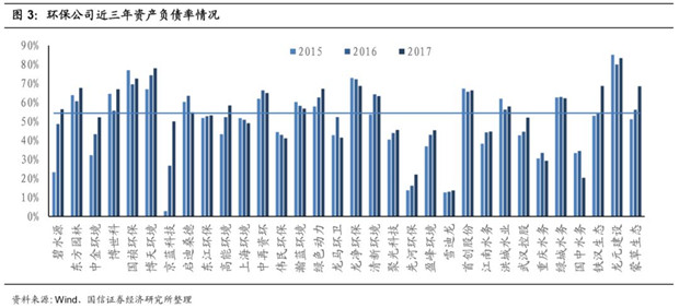 環(huán)保企業(yè)資產(chǎn)負(fù)債率逐年攀升。近年來(lái),隨著PPP的大規(guī)模拓展,環(huán)保行業(yè)投資驅(qū)動(dòng)的模式越發(fā)明顯,企業(yè)不斷融資用于投資新簽的環(huán)保工程項(xiàng)目,企業(yè)資產(chǎn)負(fù)債率逐漸提升。環(huán)保板塊主要公司的平均資產(chǎn)負(fù)債率從2015年的48%,到2016年的52%,到2017年末增長(zhǎng)到54%。