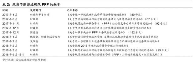 2018年下半年以來(lái),PPP項(xiàng)目的清查告一段落。在中央政治局會(huì)議強(qiáng)調(diào)“六個(gè)穩(wěn)”后,發(fā)改委要求加快推進(jìn)基建投資,基建補(bǔ)短板的功能越發(fā)重要。2018年10月31日國(guó)務(wù)院發(fā)布《關(guān)于保持基礎(chǔ)設(shè)施領(lǐng)域補(bǔ)短板力度的指導(dǎo)意見(jiàn)》明確表示,對(duì)經(jīng)核查符合規(guī)定的PPP項(xiàng)目加大推進(jìn)力度,積極推動(dòng)符合條件項(xiàng)目發(fā)行債券、規(guī)范開(kāi)展資產(chǎn)證券化。PPP被認(rèn)為是進(jìn)一步加大投入的重要推動(dòng)力,主管部門也為下一步PPP的發(fā)展做了相應(yīng)的規(guī)范和準(zhǔn)備: