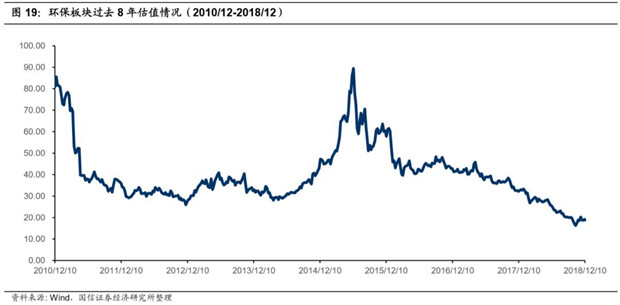 從過(guò)去8年的估值來(lái)看,環(huán)保板塊從2015年6月開(kāi)始,估值一路下挫,從2015年的86X一路下殺到到2018年12月的19倍,創(chuàng)歷史新低。從估值層面來(lái)看,環(huán)保板塊處于估值的歷史低位,下行空間不大,隨著后續(xù)政策、資金等利好兌現(xiàn),板塊估值有待修復(fù)。