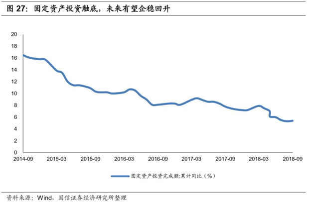 固定資產(chǎn)投資觸底。2018年1-9月,固定資產(chǎn)投資增速為5.4%,同比回落2.1pct,環(huán)比提升0.1pct,年內(nèi)首次實(shí)現(xiàn)環(huán)比提升,未來(lái)有望企穩(wěn)回升。