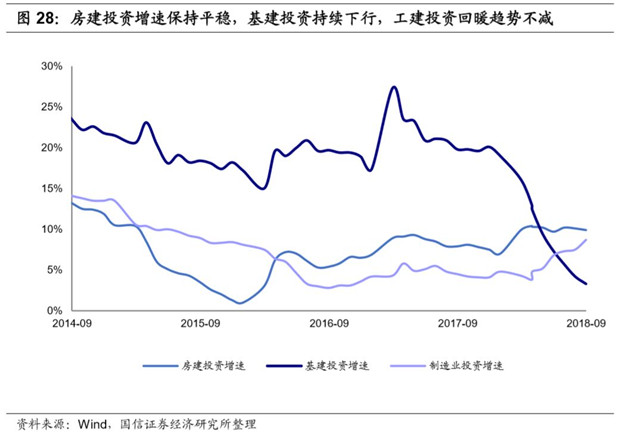 具體來(lái)看,基建投資受宏觀降杠桿、PPP清庫(kù)以及地方政府債務(wù)約束等影響,增速大幅下滑, 2018年1-9月實(shí)現(xiàn)3.3%的正增長(zhǎng),比2017年同期下滑16.5pct;房建投資受年初至今房地產(chǎn)景氣帶動(dòng),增速相對(duì)平穩(wěn),目前仍維持在相對(duì)高位的水平,2018年1-9月實(shí)現(xiàn)9.9%的正增長(zhǎng);工建投資(制造業(yè))從今年3月份開(kāi)始觸底回升, 2018年1-9月實(shí)現(xiàn)8.7%正增長(zhǎng),增速環(huán)比提升1.2pct,實(shí)現(xiàn)連續(xù)六個(gè)月回升。