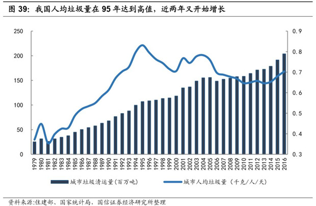 相對(duì)于美國(guó),我國(guó)城市的垃圾清運(yùn)量增速較快。從1979年開(kāi)始,我國(guó)城鎮(zhèn)垃圾清運(yùn)量以每年5.7%的增速快速增長(zhǎng)了近40年,且增長(zhǎng)態(tài)勢(shì)仍未見(jiàn)放緩。而從人均情況從1995年達(dá)到頂峰后,開(kāi)始出現(xiàn)下降。2016 年生活垃圾清運(yùn)量已經(jīng)達(dá)到 2.70 億噸,其中城市生活垃圾清運(yùn)量 2.03 億噸,縣城生活垃圾清運(yùn)量 0.67 億噸,近三年清運(yùn)量增長(zhǎng)率約在5%。