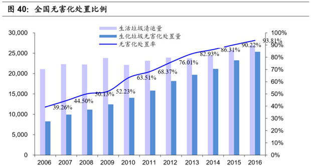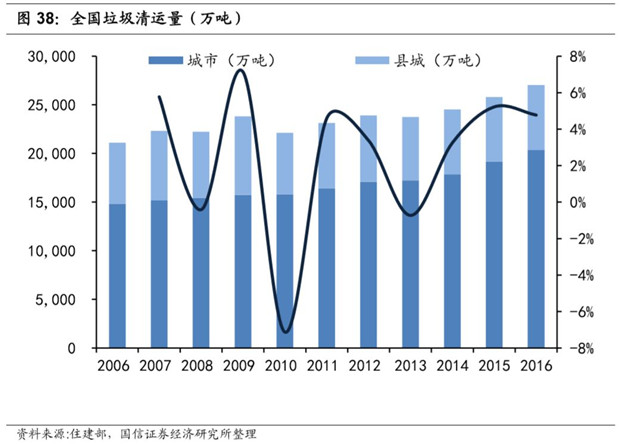 農(nóng)村地區(qū)垃圾處理仍處于初級(jí)階段。根據(jù)住建部發(fā)布的《城鄉(xiāng)建設(shè)統(tǒng)計(jì)年鑒》,農(nóng)村地區(qū)現(xiàn)每年產(chǎn)生垃圾總量穩(wěn)定在 6600 萬(wàn)噸以上,人均垃圾產(chǎn)生量穩(wěn)定處于 0.3 千克/天的水平。2016年農(nóng)村人口占總?cè)丝诘?3%,農(nóng)村的人均垃圾產(chǎn)生量和垃圾清運(yùn)比例有巨大的提升空間,所以考慮經(jīng)濟(jì)發(fā)展和農(nóng)村垃圾清運(yùn)比例的提升,我國(guó)的垃圾焚燒市場(chǎng)未來(lái)空間仍然十分廣闊。