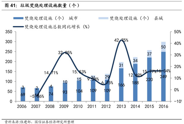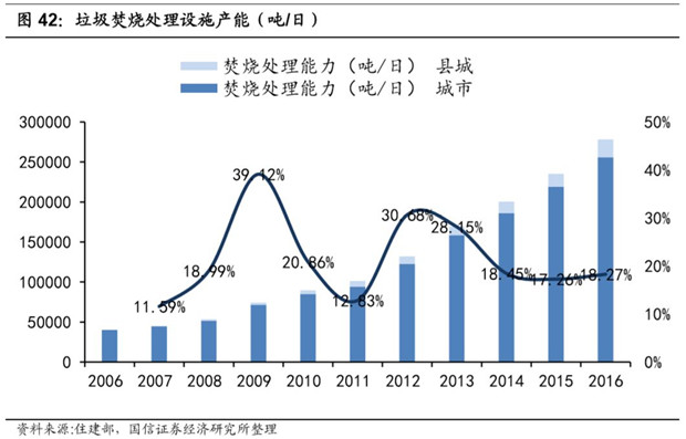 2016 年全國(guó)生活垃圾焚燒處理設(shè)施數(shù)量達(dá)到 299 個(gè),同比增長(zhǎng) 16.34%;生活垃圾焚燒處理能力達(dá)到 27.82 萬(wàn)噸/ 日,同比增長(zhǎng) 18.28%。2012-2016 年年均復(fù)合增速 20%左右。