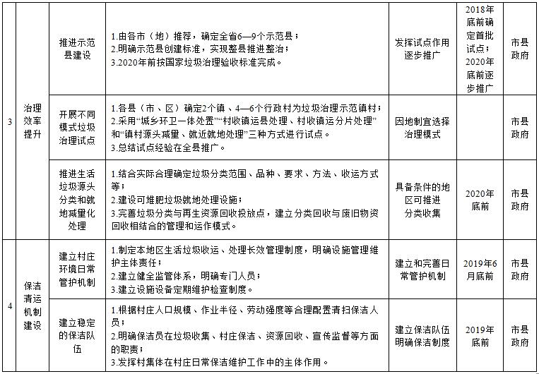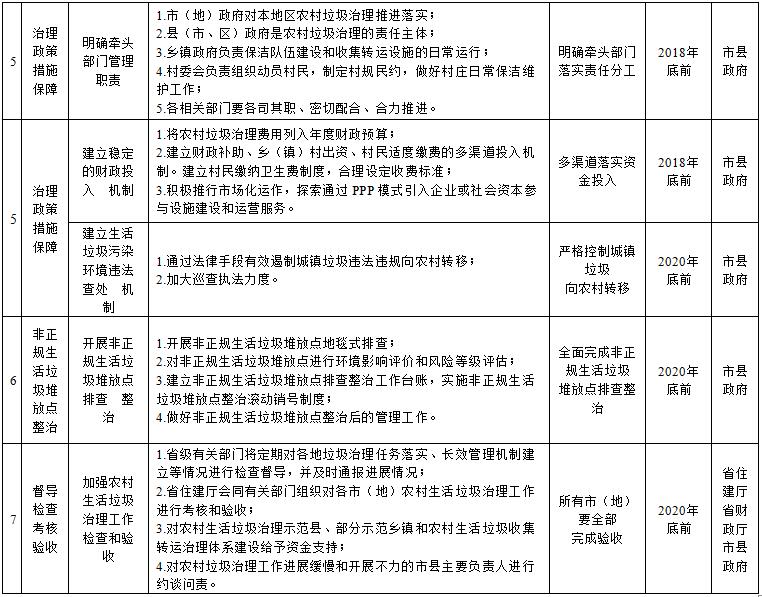 (一)制定農(nóng)村生活垃圾治理方案。各市(地)、縣(市、區(qū))要結(jié)合實際,堅持按照“統(tǒng)籌考慮、分類指導(dǎo)、經(jīng)濟適用、保證效果”的原則,制定本地區(qū)農(nóng)村生活垃圾治理三年行動方案。方案要重點確定農(nóng)村生活垃圾處理目標任務(wù)、資金投入、責任部門和保障措施,合理選擇收運處置模式和技術(shù)路線,明確各階段垃圾治理工作重點,細化年度建設(shè)任務(wù)。各縣(市、區(qū))制定方案后,要組織編制本地區(qū)農(nóng)村生活垃圾治理設(shè)施建設(shè)專項規(guī)劃方案,充分考慮空間居民點布局調(diào)整和環(huán)境影響因素,科學確定整治村范圍、收集轉(zhuǎn)運處理設(shè)施布局和建設(shè)規(guī)模,并經(jīng)專家論證通過后實施。各市縣《農(nóng)村生活垃圾治理方案》于2019年3月底前報省住建廳備案。