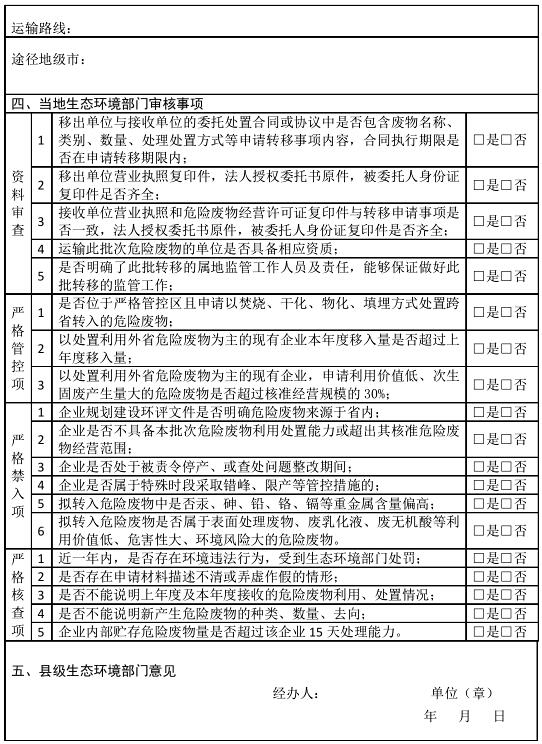 二、從嚴(yán)把控危險廢物跨省轉(zhuǎn)入。各級生態(tài)環(huán)境部門要認(rèn)真貫徹《河北省固體廢物污染環(huán)境防治條例》,嚴(yán)格控制省外的危險廢物轉(zhuǎn)移至我省行政區(qū)域內(nèi)貯存或者處置。要對照“河北省固體(危險)廢物跨省移入申請表”(附件),從嚴(yán)核查跨省轉(zhuǎn)入申請。