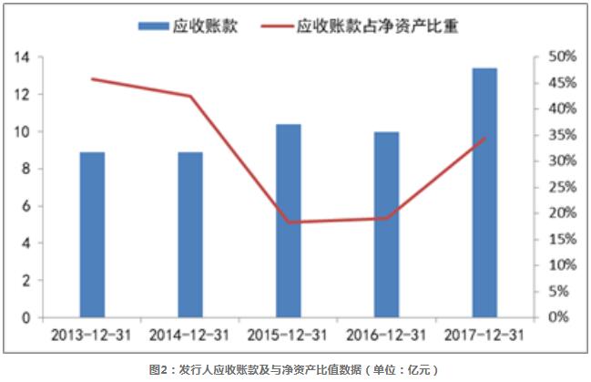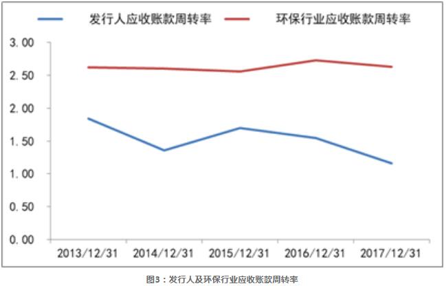 另一方面,從發(fā)行人違約前的近5年應(yīng)收賬款數(shù)據(jù)來(lái)看,如圖2所示,2013年到2017年,發(fā)行人的應(yīng)收賬款規(guī)模不斷增加,由8.91億元增長(zhǎng)到了13.39億元,其與凈資產(chǎn)的比值在發(fā)行人戰(zhàn)略轉(zhuǎn)型前的2013-2015年區(qū)間不斷下降,但轉(zhuǎn)型后該比值卻一路上升,由2015年的18.37%增長(zhǎng)到了2017年的34.40%;應(yīng)收賬款年周轉(zhuǎn)率2015年后也不斷下滑,從1.70降到了1.16,發(fā)行人的應(yīng)收賬款周轉(zhuǎn)率數(shù)據(jù)弱于環(huán)保行業(yè)整體水平。同時(shí),根據(jù)發(fā)行人2018半年報(bào)中數(shù)據(jù),截至2018年6月底發(fā)行人處于施工期BOT訂單11個(gè),未完成投資額37.72億元,尚未執(zhí)行的訂單27個(gè),擬投資金額為30.55億元,發(fā)行人未來(lái)的投資需求較大,資金壓力較大。