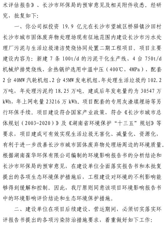 日前,湖南生態(tài)環(huán)境廳批復(fù)了長沙市污水處理廠污泥與生活垃圾清潔焚燒協(xié)同處置二期工程項目環(huán)境影響報告書。