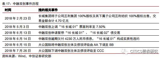 中融雙創(chuàng)由自然人牛相坤、潘長清于2012年11月共同出資成立,設(shè)立時(shí)公司名稱為鄒平長城實(shí)業(yè)有限公司。主要從事鋁精深加工、能源物流、現(xiàn)代農(nóng)業(yè)以及紡織品生產(chǎn)與銷售業(yè)務(wù),鋁精深加工業(yè)務(wù)是其主要的收入和利潤來源。2018年6月14日,公司發(fā)布公告稱 “16長城01”應(yīng)于6月13日付息及兌付回售部分本金,截至當(dāng)日尚未能按照約定將本期利息4230萬元?jiǎng)澲镣泄軝C(jī)構(gòu),構(gòu)成實(shí)質(zhì)性違約。