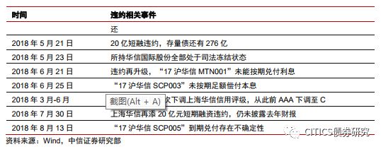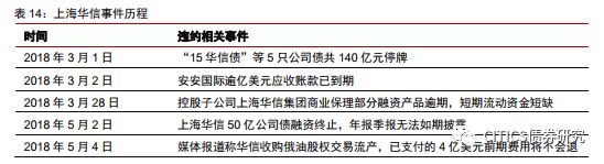上海華信是一家主要從事石油貿(mào)易的公司。經(jīng)過多次增資及股權(quán)變更,公司控股股東為中國華信,實(shí)際控制人為蘇衛(wèi)忠和鄭雄斌。2018年3月,受媒體新聞事件等不利因素的沖擊,多家評級(jí)機(jī)構(gòu)連續(xù)下調(diào)公司主體及債項(xiàng)信用等級(jí),流動(dòng)性資金短缺。2018年5月至今,相繼有4只債券(“17滬華信SCP002”、“17滬華信MTN001”、“17滬華信SCP003”、“17滬華信SCP004”)違約,違約金額高達(dá)85億元。
