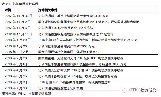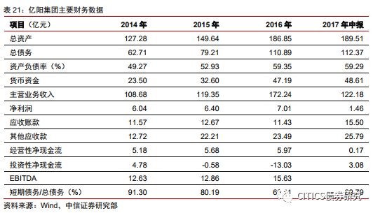 (3)母弱子強(qiáng),子公司盈利下滑觸發(fā)多只債券相繼違約。2017年中報(bào)中貨幣資金總額為48.6億元,其中17.4億元?dú)w屬于上市子公司億陽信通,而負(fù)債主要集中在母公司。億陽信通前三季度業(yè)績同比虧損6124.09萬元,聯(lián)合評級(jí)下調(diào)其信用評級(jí),外部融資進(jìn)一步惡化。2018年年初“16億陽01”的實(shí)質(zhì)性違約,進(jìn)一步暴露集團(tuán)內(nèi)部流動(dòng)性收縮以及外部融資渠道不暢等風(fēng)險(xiǎn),此后三個(gè)季度內(nèi)相繼有4只債券違約。