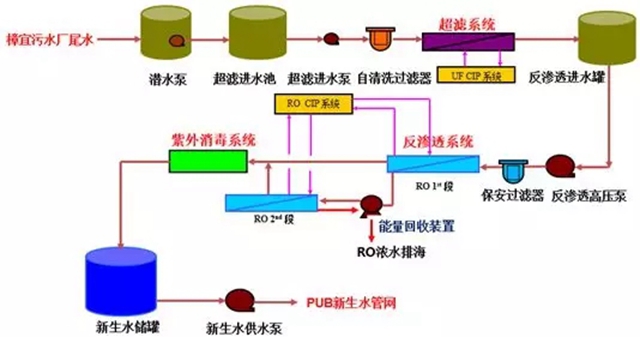 本項(xiàng)目采用了超濾、反滲透、UV殺菌三段工藝(工藝流程如圖2所示)。原水是樟宜污水廠二級(jí)生化處理出水,其主要污染物為懸浮顆粒物、有機(jī)污染物、溶解性無(wú)機(jī)物、細(xì)菌、病毒等。超濾工藝段主要目的是降低水的濁度,去除水中的懸浮顆粒物、大分子有機(jī)物和細(xì)菌等。反滲透工藝段采用過(guò)濾孔徑小于1納米的反滲透膜,去除各種小分子無(wú)機(jī)鹽、有機(jī)物和病毒。UV殺菌段進(jìn)一步殺滅水中殘留的致病菌和病毒,最終成品水進(jìn)入新生水儲(chǔ)罐,由新加坡公用事業(yè)局進(jìn)行統(tǒng)一調(diào)配。反滲透系統(tǒng)采用一級(jí)二段式,一段反滲透的濃水再經(jīng)過(guò)二段反滲透,進(jìn)一步回收淡水,在一段反滲透和二段反滲透之間增加能量回收裝置,達(dá)到節(jié)能目的。