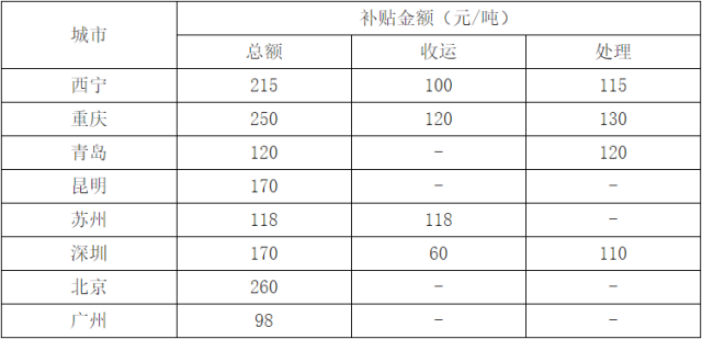 2)收運環(huán)節(jié):主要由地方財政和地方環(huán)衛(wèi)部門進行管理,向作業(yè)公司進行一定補貼;