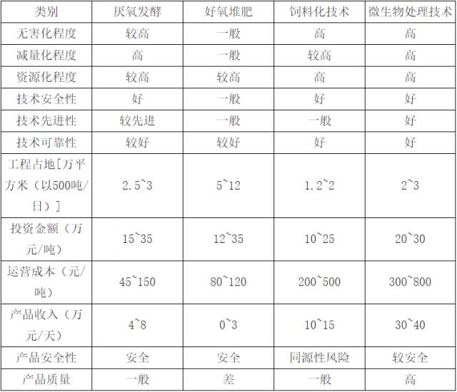 2)從經(jīng)濟效益比較,我們以日處理規(guī)模為500t計算,盡管資源化處理的費用最高,但其總收益也最大,綜合來看年均收益能達到 1435 萬元。資源化處理方式又細分為厭氧發(fā)酵、好氧堆肥、直接烘干做飼料和微生物處理等。