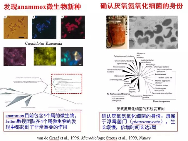 Anammox現(xiàn)象被發(fā)現(xiàn)之后,Kuenen教授的一位主要助手Mike Jetten博士專注于Anammox的微生物學(xué)研究,并在加盟荷蘭奈梅亨大學(xué)微生物系之后,組織團(tuán)隊(duì)展開了長(zhǎng)期的基礎(chǔ)研究工作,發(fā)現(xiàn)和培養(yǎng)了新的參與氮、硫和碳轉(zhuǎn)化的微生物,采用分子生物學(xué)、結(jié)構(gòu)化學(xué)和宏基因組學(xué)從基因、細(xì)胞、個(gè)體和生態(tài)系統(tǒng)水平揭示相關(guān)微生物的反應(yīng)機(jī)理。