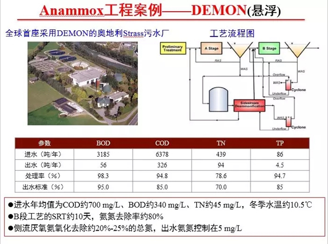 奧地利Strass污水處理廠是全球首座采用DEMON的污水廠。污泥消化液的厭氧氨氧化主要有兩個(gè)方面的核心技術(shù):一是基于pH的DO實(shí)時(shí)控制短程硝化,另一個(gè)是基于物理分離技術(shù)實(shí)現(xiàn)雙泥齡,采用旋流分離器(DEMON1.0),后改進(jìn)為微篩選擇器(DEMON2.0)。Strass污水廠目前在厭氧氨氧化做的非常成功,氨氮去除率約80%,總氮去除率20%-25%,出水氨氮控制在5mg/L以下。目前這種工藝在美國(guó)、德國(guó)、瑞士等也都做的非常好。