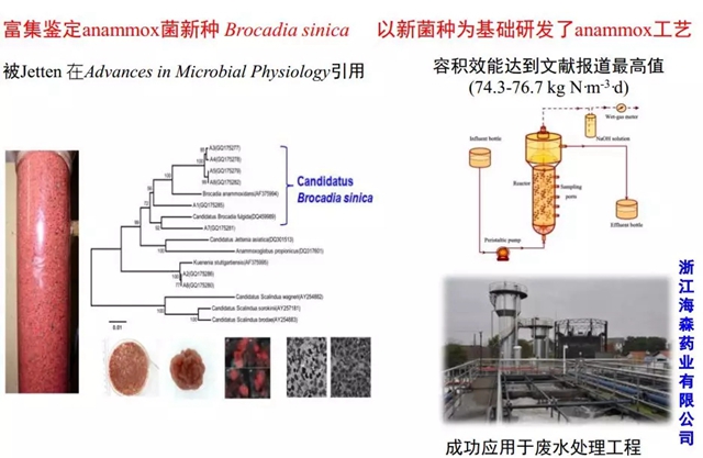 鄭平教授團(tuán)隊(duì)改進(jìn)的Anammox工藝容積效能達(dá)到文獻(xiàn)報(bào)道最高值(74.3~76.7kg N·m-3·d),并成功應(yīng)用于浙江的海森藥業(yè)有限公司廢水處理工程,這是中國(guó)第一個(gè)厭氧氨氧化廢水處理的實(shí)際工程。