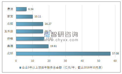 2018年全國環(huán)衛(wèi)領(lǐng)先企業(yè)3年以上項(xiàng)目年服務(wù)總金額情況