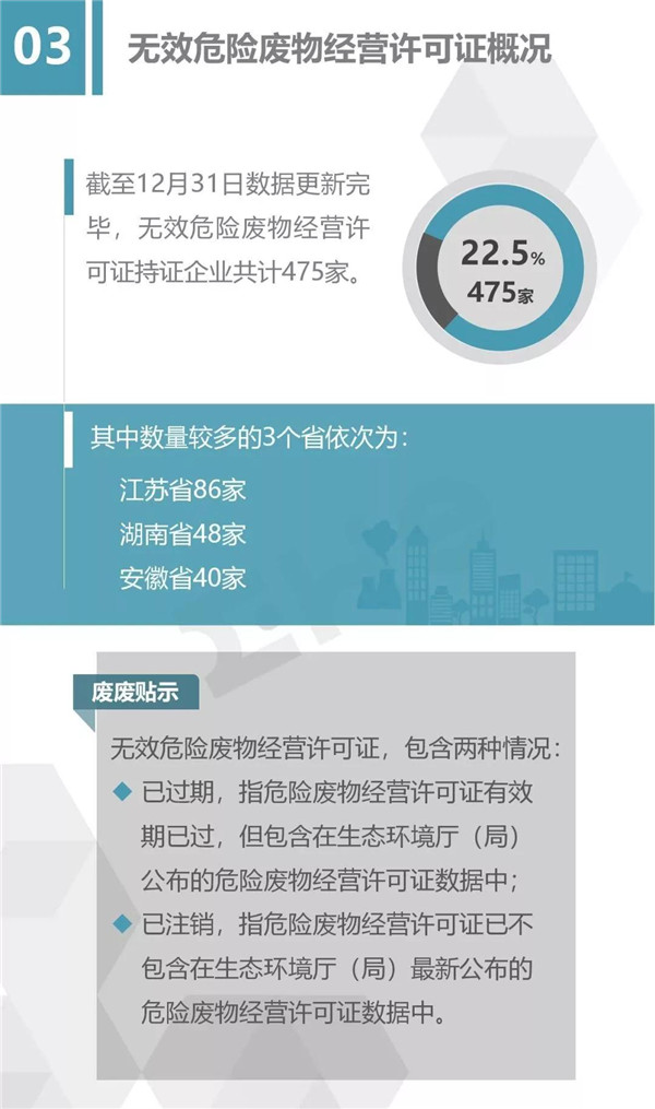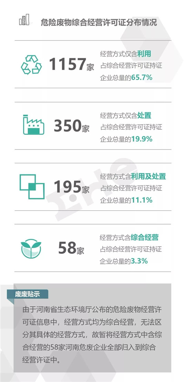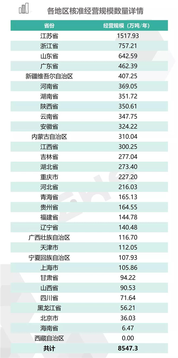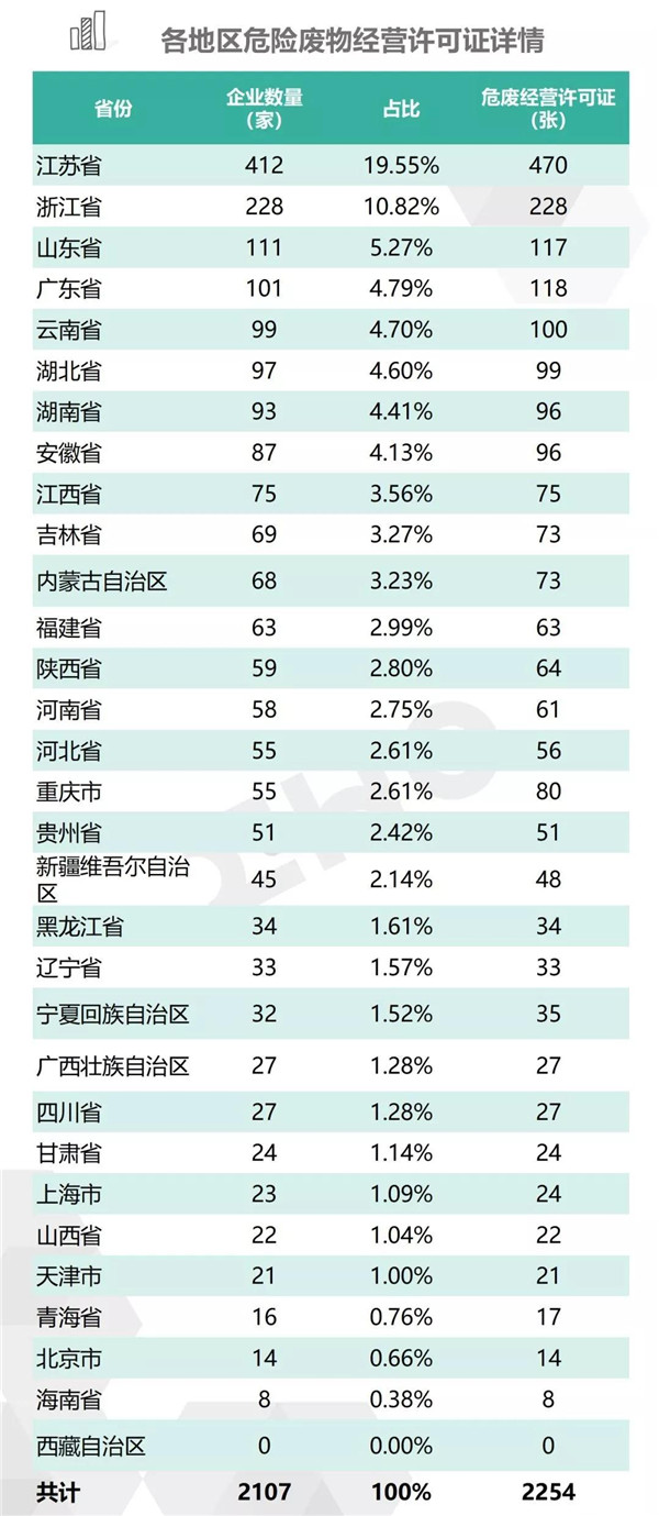 2.統(tǒng)計(jì)范圍:本次數(shù)據(jù)收集統(tǒng)計(jì)的范圍為省級(jí)生態(tài)環(huán)境廳(局)官方公布的持有危險(xiǎn)廢物經(jīng)營(yíng)許可證企業(yè)的數(shù)據(jù),因此由地級(jí)市發(fā)布的醫(yī)療廢物經(jīng)營(yíng)許可證、收集經(jīng)營(yíng)許可證,且未納入省級(jí)生態(tài)環(huán)境廳(局)公布數(shù)據(jù)的部分,并未計(jì)入統(tǒng)計(jì)數(shù)據(jù)中。