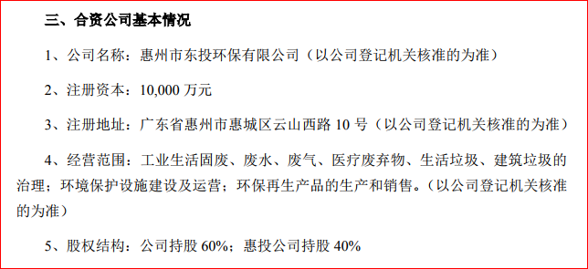公告顯示,東江環(huán)保擬與與惠州市投資管理集團有限公司(簡稱“慧投公司”)共同出資在惠州市成立合資公司,公司名擬定為“惠州市東投環(huán)保有限公司”,注冊資本1億元,東江環(huán)保與慧投公司分別出資6000萬與4000萬元人民幣,分別持股60%和40%的股權。